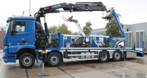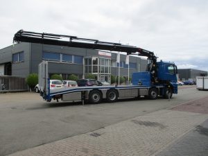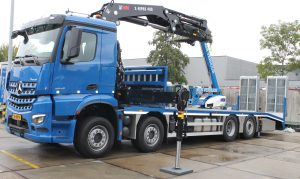 MSR Verhuur te Spijkenisse heeft hun nieuwe Mercedes-benz Arocs in ontvangst genomen. Deze 8×2 is voorzien van een 450PK sterke motor, waarmee het vervoer van de meest uiteenlopende (verhuur)materialen een plezier wordt. In samenwerking met Hiab Benelux B.V. hebben we deze oprijcarrosserie mogen realiseren. De afgeschuinde laadvloer is voorzien van hydraulische dubbel-scharnierende oprijbanen, laadvloer voorzien van diverse sjor-ogen, onderbouwkisten in RVS uitgevoerd en een Hiab X-HiPro 408 E7, welke op 18,5 meter nog 1420KG heft.
